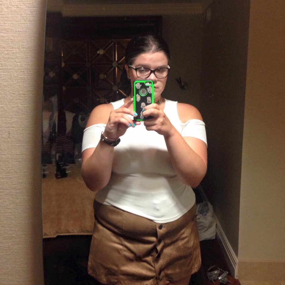 Skirt- I wore this brown almost suede looking skirt with buttons on the front... from where else... American Eagle. This one is kind of weird because its an extended size that was online only... but the sizes only go up to 14 I think and they had up to 12 in store... and its like "really? You can't just put one more size in the store?" but whatever. Lol. I also wore a pair of short booty shorts underneath because you could kind of see my underwear if I bent down and I'm not about that... so where this with tights, leggings or a pair of booty shorts underneath lol.